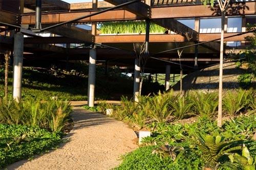 由于房屋懸空,在房屋下面種植蕨類,花卉甚至蔬菜,于是房屋就像三文治一樣,為屋頂植被和屋下花園這兩層綠色平面所包裹。