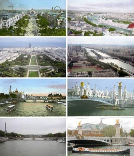巴黎是一座古典型城市,不會(huì)像上海那樣發(fā)生翻天覆地的變化。作為一座歷史悠久的古城,巴黎的很多地區(qū)在過去一個(gè)世紀(jì)幾乎沒有發(fā)生任何改變,只有樹木隨著時(shí)間推移不斷長高長大。但并非整個(gè)巴黎都處在“不變”之中。最后兩幅圖片呈現(xiàn)了同一個(gè)商業(yè)區(qū),分別拍攝于1960年和2006年,變化之大我們一看便知。第二幅照片中最引人注目的建筑當(dāng)屬巴黎第一高樓——拉德芳斯大廈。在照片的背景,我們還能看到大名鼎鼎的埃菲爾鐵塔。
