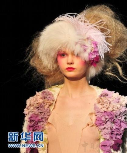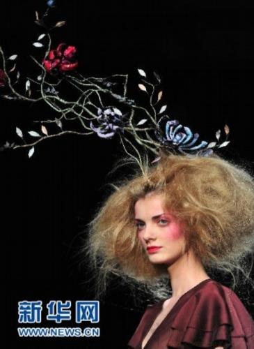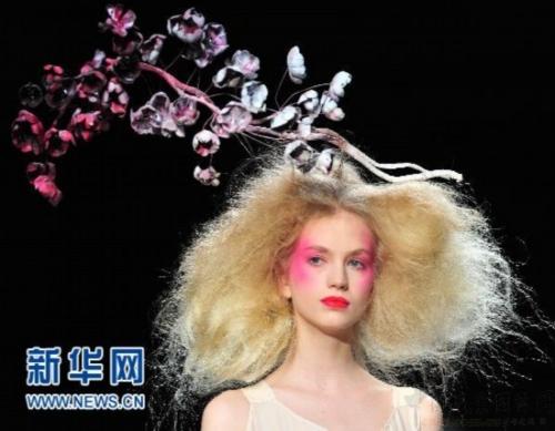 在2011年西班牙馬德里秋冬時裝周上,西班牙時尚設計師埃莉薩·帕洛米諾推出的作品以夸張的發(fā)型設計與花卉裝飾成為一大亮點。 新華社記者陳海通攝
