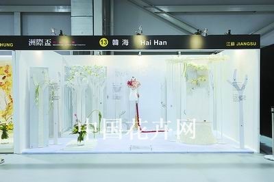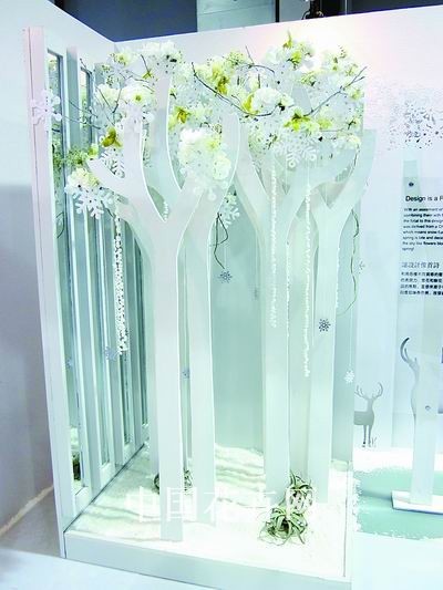 整個展位表現雪景中的植物。白色的背景板、白色的構架、白色的鮮花,清新脫俗,主題突出。