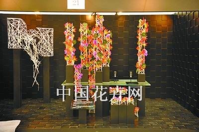 餐桌花的設計頗為搶眼。以實木制做的黑色柱子高低起伏,如同拔地而起、穿出桌面生長而成。紫色的蝴蝶蘭、紅色的嘉蘭、珊瑚鳳梨以及心形的安祖花葉子順勢而上,色彩絢麗,歡快而熱烈。自由作品也同樣襯托了這一主題,兩根黑色的柱子一高一低、一前一后,其上的白色構架是以不銹鋼條做成的立體結構,所有鋼條都用毛線纏繞,兩個構架拼合在一起正好可組成方形,仿佛是以S形切開后再分別固定于兩柱之上。切面處的花枝螺旋而下,交織在一起。