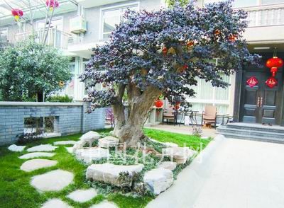 絢麗的植物是花園演繹季節變化的最佳要素。原有的植物配置有些凌亂、單調,布局也有所欠缺。為了讓植物景觀不僅觀賞性更強,還能為花園生活增添更多情趣, 設計師在入口親水平臺靠內側的角落栽種了一株胸徑為25厘米的高大桂花樹。繁茂的枝葉讓樹冠蓬松、圓潤,成為炎炎夏日里遮陰避暑的天然遮陽傘,這樣坐在親 水平臺上欣賞園中美景就不會太辛苦咯!略微有些傾斜的主干,與一塊塊形狀各異的天然山石相搭配,讓人感覺這株桂花好像是建院之初就長在那里的“老住戶”, 極具自然韻味的景致也體現出設計師的良苦用心。到了秋季,滿樹金黃色的桂花隨風送來略帶甜味的馨香,極具誘惑力。而零星落在水面上的嬌小花朵,又讓水池成 為一件精美的琉璃藝術品,令人沉醉。