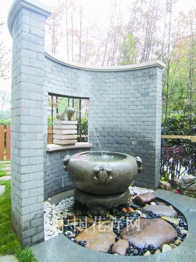 龍頭噴泉、古典風格的跌水、折疊式景墻、親水平臺巧妙組合,讓大門一側的水景區成為花園亮點