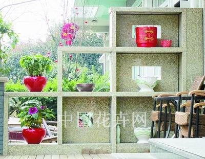 設置在房屋入口休閑平臺一側的擱架,虛實分隔左右空間,還可擺放花草,供人欣賞