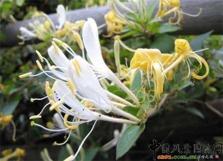 別名 忍冬、金銀藤、銀藤、二色花藤、二寶藤、右轉藤、子風藤、鴛鴦藤,為忍冬科忍冬屬多年生半常綠纏繞木質藤本植物。“金銀花”一名出自《本草綱目》,由于忍冬花初開為白色,后轉為黃色,因此得名金銀花。