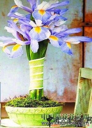 做法:切割花泥,讓它正好能夠放入碗中;將鳶尾花頭排列勻稱,底端修剪整齊,預留出5~7厘米的長度,以便能夠插入花泥;用和花器同色系的絲帶將鳶尾的莖纏起,用別針固定;鳶尾的上部和底部用橡皮筋固定,將底部插入花泥;最后用苔蘚將花泥蓋住,增加美感。