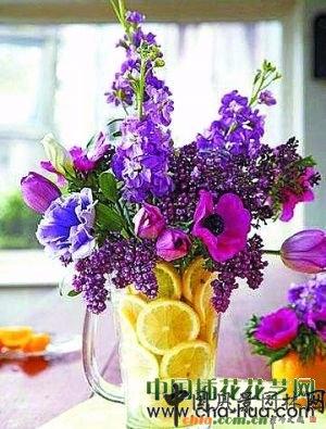 對比色的運用會帶來更賞心悅目的效果,因為檸檬片為明黃色,所以最適合搭配紫色調的花材。