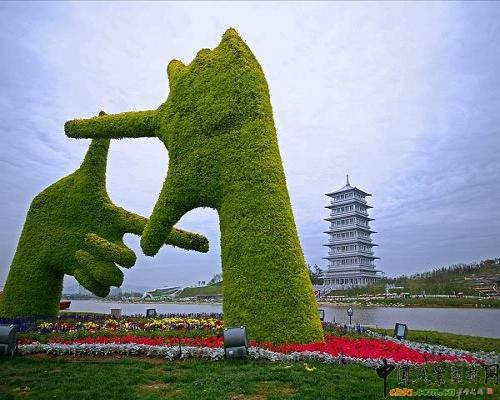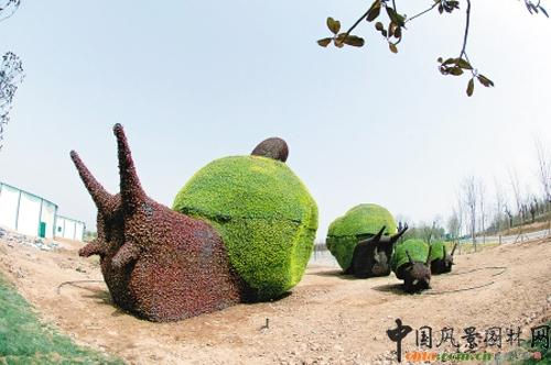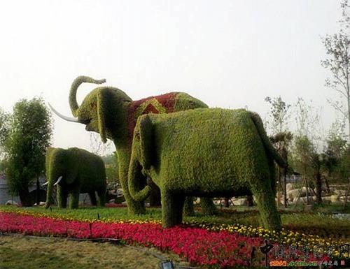 “綠雕”被譽為世界園林藝術(shù)的奇葩,是一種有生命的植物雕塑。一般內(nèi)設(shè)鋼材構(gòu)架,然后在構(gòu)架上填充栽培土,再于其上種植一年生或多年生小灌木或草本植物,即采用掛泥插草或卡盆工藝把不同顏色的花草覆蓋在結(jié)構(gòu)造型的表面,巧妙地把雕塑造型與花卉園藝結(jié)合在一起,鋼架表面的植物覆蓋率至少要達到80%。因此,綠雕是充滿生機的“花卉雕塑”,是人類運用自然力量創(chuàng)造出的又一園藝文明。