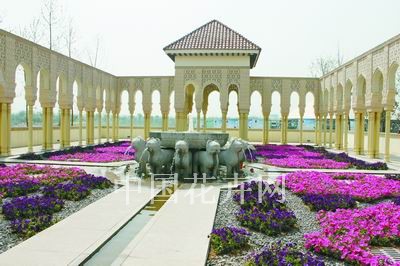 尼日利亞園的建筑風格獨特,它通過沙生植物、水生植物、熱帶雨林植物的變化,勾勒出“沙漠景觀———稀樹草原景觀———熱帶雨林景觀”的設計層級。