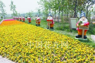 德國展園內鋪裝特色道路,中央有一隱形花帶,體現德國特色的花卉。靠近湖面有一個沙灘及親水平臺,給人一種親臨海邊眺望大海的意境,而站在花海邊上的小矮人讓人倍感親切。