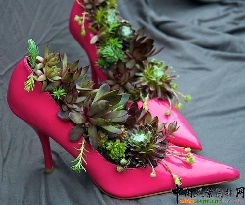 還有什么比這樣的盆花藝術作品更適合用于婚禮或生日派對的呢?這些經過特殊處理的高跟鞋,在靠近腳趾的位置被預留了排水孔,水分會沿著高跟鞋自身的曲線完成全部的灌溉過程。