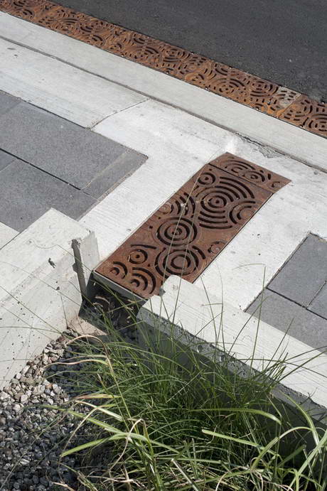 樹木和裝飾草坪裝備的是適應(yīng)暴雨水的過濾容器,在雨水流入污水處理系統(tǒng)之前,收集過濾地表雨水到容器中,是一種優(yōu)良的可持續(xù)雨水管理措施。出入口的門是帶裝飾生鐵,控制管理雨水進出,冬季時這個門可以防止鹽分過度使土壤板結(jié)。本地植物的選擇充分考慮到四季時間、耐旱性和耐鹽性。