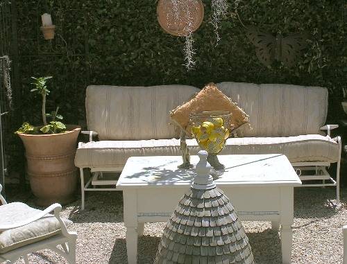 將各種有趣的家具和園林小品進(jìn)行有機(jī)組合,形成了一個完美的迷人的戶外客廳。石質(zhì)天井地板與白色沙發(fā),椅子和表,西班牙苔蘚與鐵涼亭的自由混搭。容器中的檸檬則增添了新鮮的色彩和自然飛濺“熱情”。