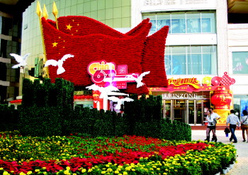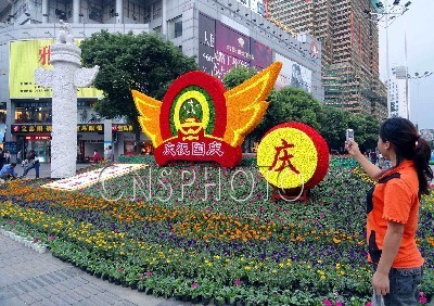 近日,蘇州街頭上,可以看到很多國慶主題的花壇。
