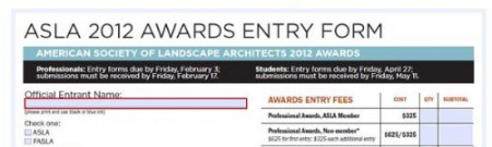 2011年11月30日,2012美國(guó)景觀設(shè)計(jì)師協(xié)會(huì)(ASLA)年度獎(jiǎng)項(xiàng)作品征集工作正式啟動(dòng),即日起可向組委會(huì)提交報(bào)名表格和作品集。ASLA年度獎(jiǎng)項(xiàng)分為專業(yè)獎(jiǎng)和學(xué)生獎(jiǎng)兩部分,二者都包括綜合設(shè)計(jì)、居住設(shè)計(jì)、分析和規(guī)劃、交流和研究等五類獎(jiǎng)項(xiàng)。此外,專業(yè)獎(jiǎng)還包括地標(biāo)建筑獎(jiǎng),而學(xué)生將還包括社區(qū)服務(wù)獎(jiǎng)和學(xué)生合作獎(jiǎng)兩類獎(jiǎng)項(xiàng)。