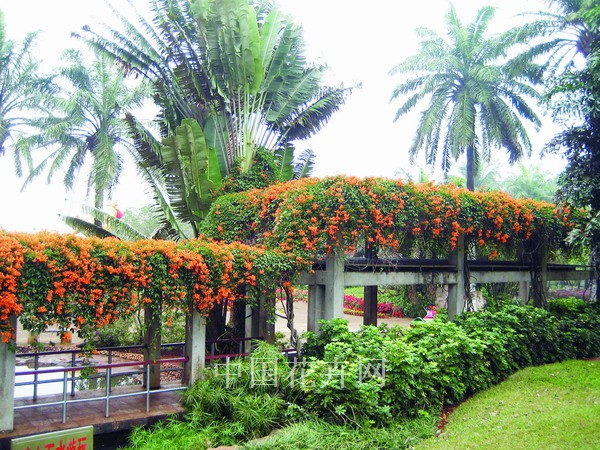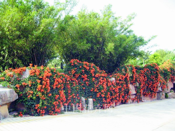 在南方地區,如海南、廣東、福建等地的公園里,都可見到用炮仗花巧妙布置的花架和廊亭。栽植于這里的炮仗花在一兩年內便可利用卷須緊密纏繞在水泥支架或廊亭的依附物上,枝葉蓬松,紅花似火,蔚為壯觀。特別是在濕地公園有水的廊亭處,栽植炮仗花成景后,體現出一種色彩和層次搭配協調的植物配置藝術。游人坐在花架和廊亭里,能感受到繁花爛漫,其倒影映入水中,仿佛置身于人間仙境,美不勝收。如果利用炮仗花在廣場中設置廣場花架,可起到極妙的點綴作用,也可成為休息、遮陰、納涼的場所,用花架聯系分隔的空間,可使廣場空間變化趨于多樣,體現出植物景觀的多層次拓展空間的功能。