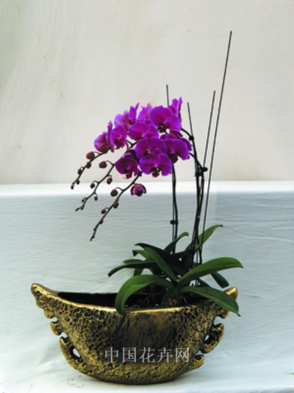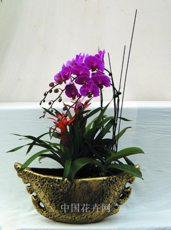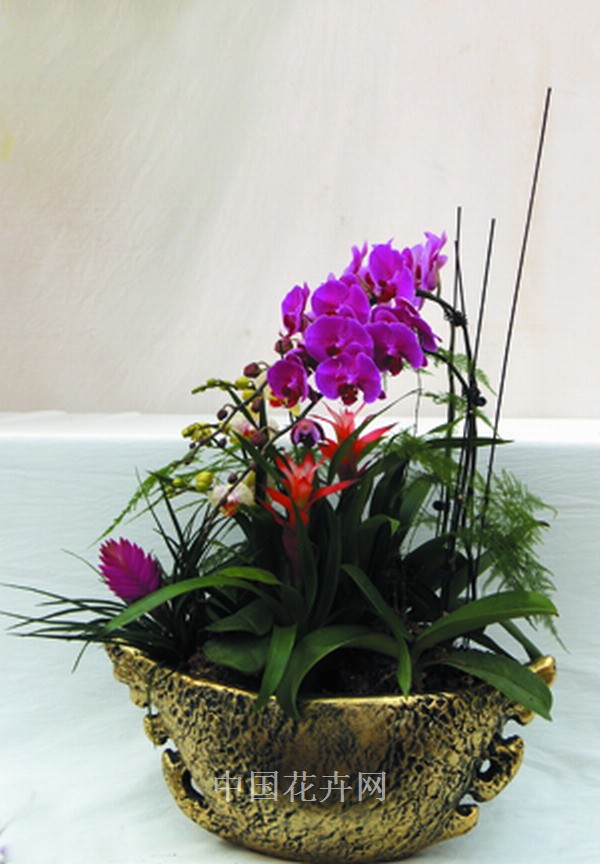 第三步:植入兩株淡色迷你蝴蝶蘭,同樣方法固定,使其與大花蝴蝶蘭相呼應(yīng)。