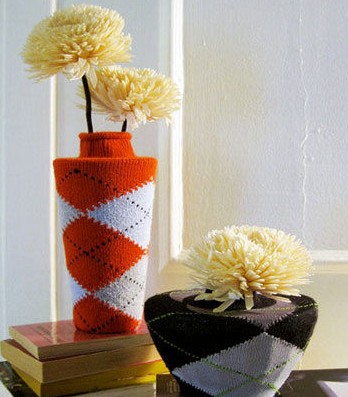 這實在是一個很普通,但又非常出效果的方法。去襪子小店挑選幾雙長筒的襪子,顏色花紋都可以根據你自己的喜好來選擇。然后輕輕松松取出剪刀,沿著腳后跟上側剪平, 就成為了長形花瓶漂亮的外套了。