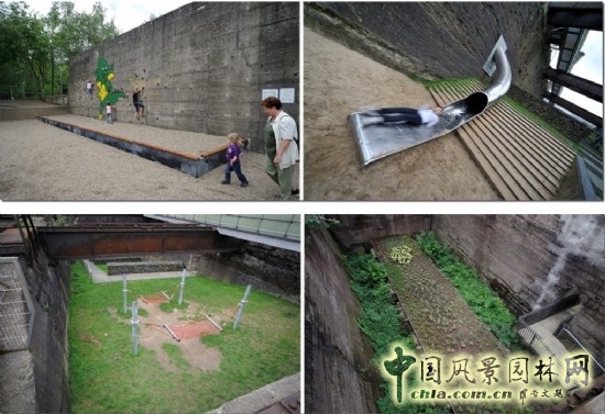 這里曾經是德國最重要工業基地的魯爾區,20世紀90年代,著名景觀設計大師彼得·拉茨進行了一項對歐洲乃至世界上都產生重大影響的項目──國際建筑展埃姆舍公園(IBAEmscherpark)。它的最大特色是巧妙地將舊有的工業區改建成集合公眾休閑、娛樂、教育文化的場所,并且仍基本保留原有的工業設施,又創造了一種獨特的工業景觀,賦予舊的工業基地新的生機。杜伊斯堡風景公園(Landschafts park Duisburg Nord)是其中最引人注目的公園之一。