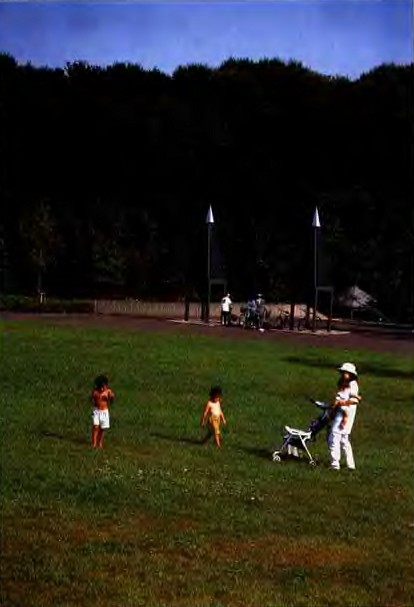 其次,作為景觀設計的基本要素"綠",通過斜面緩坡的自然林得以表現,"水"則由園內匯水的修景池,"大地"用充滿生機的緩坡草坪等對大地景觀進行了充分的展示和描述。