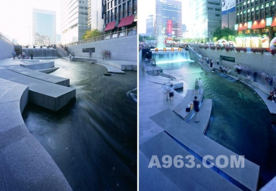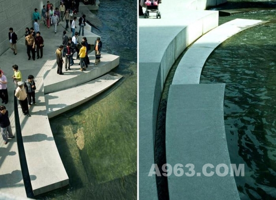 設計也考慮到季節(jié)以及一天中水位的變化,也解決了暴雨洪水期間引發(fā)的問題。石材獨特的傾斜角度鼓勵公眾參與親水活動。這一片區(qū)域是7公里河道改建的先行部分。從05年10月剪彩到現(xiàn)在,已經(jīng)有不計其數(shù)的人們到訪過這里。