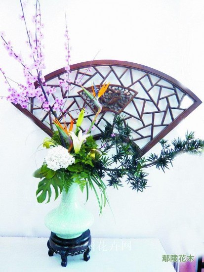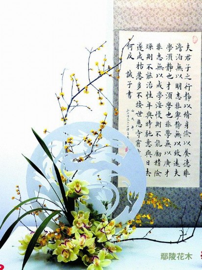 在此次插花作品中,不僅可以看到這樣的經典組合,而且在容器、配飾的選擇上,更加突出了傳統插花的文化底蘊。白色的鏤空龍形圖案,配以黃色的蠟梅和蘭花,背景再掛上一幅詠梅字畫,文化氣息躍然而生;圓潤剔透的白色瓷瓶,信手插上一枝梅花,演繹出梅花特有的素雅本色;古香古色的屏風、窗欞,配以傳統菊花,將梅花襯托得格外俏麗而悠古。(如圖一至四)