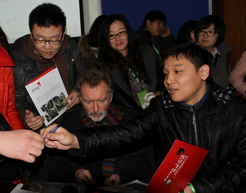 大家聽的都很入迷,報告會后人潮涌動,競相上前與大師簽名合影。我極力保護著這位令人崇拜的大師,險些被沖倒。大師面對蜂涌上來的粉絲無可奈何,一個個簽著名。從他的神情中能看到他對年青設計師的愛護,也能看到他的無奈,當然還有欣慰。