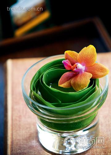 制作:將葉片卷起放入瓶中,再在上面插入蝴蝶蘭。