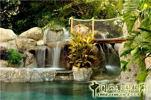 游泳池是熱帶景觀中常會有的設備,造型多樣,自然造型的如同在熱帶雨林或叢林中偶然發現的水池,而實際上這種游泳池是用人造巖石建成,有時花園里還會有精巧的疊石理水:瀑布、跳巖、水滑道等。游泳池的內部常用色彩明亮的石材鋪裝,可以加強整個庭院的色彩表現。
