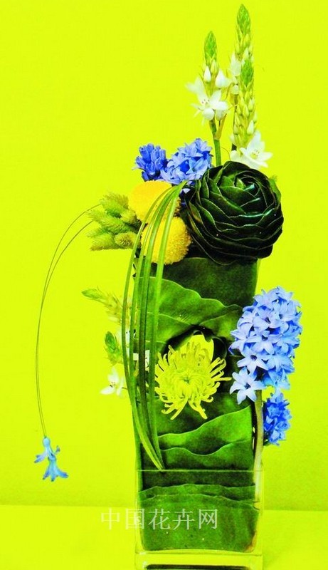 這款以春天為主題的花藝作品是臺灣花藝師陳垂訓的教學示范作品。其主體造型是以蘇葉包裹花泥制作而成,中空的設計獨具特色,一朵菊花巧妙嵌入其中,紫色風信子、熊草、麥穗等常見花材淡雅、高貴,帶來了春的氣息。作品上部那朵“綠色玫瑰”是該作品的最大亮點,花藝師將一片片茶花葉粘貼成玫瑰形狀,精巧而別致。