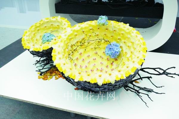 大小兩個半球形的花藝作品被擺放在展位中最顯眼的位置(圖1),半球體是將泡沫球挖空制作而成的。明艷的黃色蝴蝶蘭仿佛涂層一般附著于泡沫球內壁之上,立體的粉紅色花心晶瑩剔透,盡顯花材的艷麗;亮黃色的文心蘭花朵勾勒出半球的邊緣,精致可愛,深淺不一的黃色也讓作品看上去更具立體感;3朵藍紫色繡球花和幾枝空氣鳳梨隨意地點綴在作品之上,鮮明的色彩對比更加強了整個作品的視覺沖擊力,很好地映襯出洋蘭的柔美。仔細觀看,會發現一根水管從繡球底端延伸出來,為了延長花藝作品的保鮮期,陳垂訓將繡球插在玻璃試管中,然后將試管與灌滿水的水管相接,經過這樣處理的花卉可延長保鮮期一周。