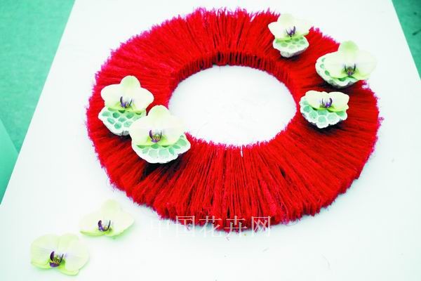 少量的蝴蝶蘭也可以設計出精美的花藝作品,并且更易向家庭推廣。陳垂訓將紅色瓊麻絲剪成長條狀,然后以5片至10片為一組粘在一起,將多組瓊麻絲緊密相連拼成圓環形固定在白色木板上。之后,用5朵白色蓮蓬頭點綴于紅色圓環之間,幾朵淡黃色的蝴蝶蘭花瓣輕巧地“漂浮”在蓮蓬頭上(圖2)。作品采用歐洲花藝師較少使用的大紅色為基調,顯得格外搶眼,也更加突出了蝴蝶蘭的清雅高貴。整件作品簡潔實用,既可作為壁飾掛于居室,又可平放在桌面,吸引了眾多歐洲觀眾的視線。