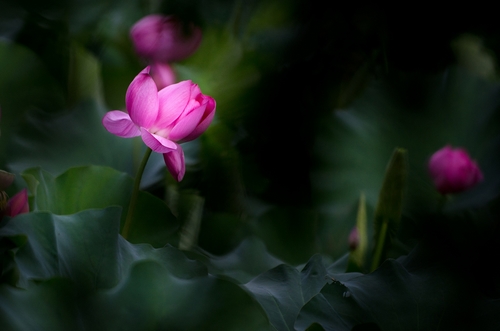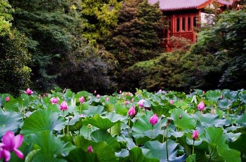 荷花,又名芙蕖、水芙蓉,為多年生植物。花單生于花梗頂端,少有并蒂蓮出現。花有單瓣、復瓣、重瓣等花形,花色有白、粉、深紅、淡紫色或間色等變化,植物園以粉色花為主。觀賞地點——蘭室與盆景園間的池塘。