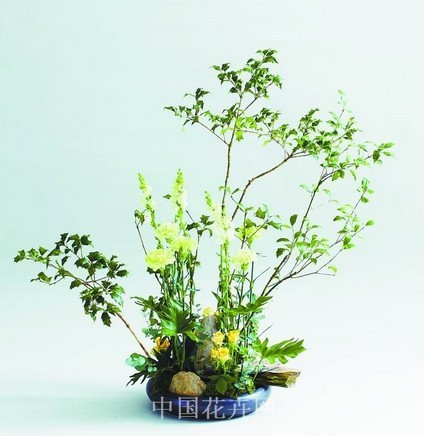 插制自然景觀作品并不難,只要做到:1.以自然為主題;2.主枝條以平行垂直方向插入,周邊枝條依自然曲線為安排;3.底部鋪陳自然,不可使用堆疊手法。花藝師需時常接近大自然,才能在此花型創作上多有感悟。