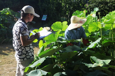 近日,上海植物園科研人員赴古猗園進行為期一周的荷花生長狀況調(diào)查,主要針對古猗園現(xiàn)有的荷花品種,對其缸栽荷花的立葉數(shù)、葉梗高度、荷葉直徑、著花密度、開花直徑、花梗高度、外瓣長寬等基本參數(shù)進行調(diào)查,以期得到基本數(shù)據(jù)進行下一步研究。