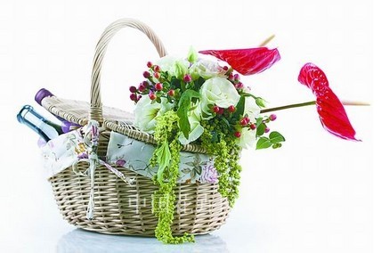 制作步驟:1.將花泥切成適宜的大小,再用玻璃紙包裹花泥下端并用透明膠固定,以防止水流入花籃,放一邊待用;2.取出一個兩側帶翻蓋的歐式花籃;3.花泥固定好后開始插花,先插入洋桔梗制作出花球的框架,再填充金絲桃,插出一個半開方式的半圓形;4.插入紅掌向外的線條拉伸,豐富作品的空間延伸感;5.調整花型,并插入下垂的情人淚做裝點,花藝部分完成;6.在花籃的另一側放入兩瓶葡萄酒,并用麻絲做填充及裝飾。