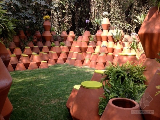 pedro&juana建筑事務所的優秀設計擴大了花園,創造了一個可以體會泥土、空氣和植物的空間。建筑師使用陶土罐來建造亭子,這種陶土罐的外形參考了luis barragán花園中所用的花瓶。黃色頂部是隨機放置在上面的一些花瓶,這些花瓶用來提供分層疊布的感覺。