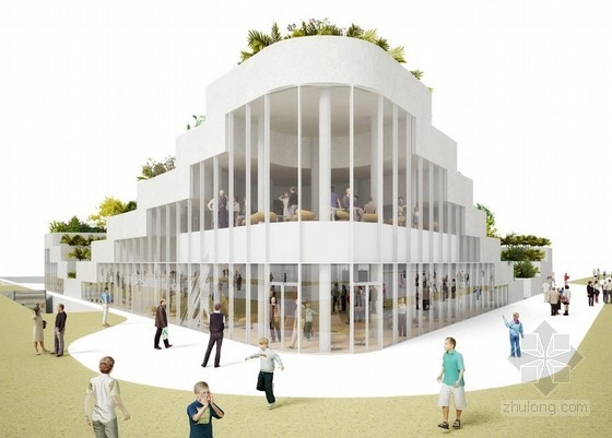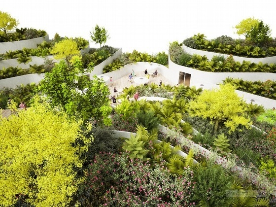 由荷蘭NL architects建筑事務(wù)所設(shè)計(jì)的“三亞超級(jí)市場(chǎng)”將于2014年完工,這個(gè)項(xiàng)目位于中國(guó)海南省三亞,建筑師在一個(gè)抬升的梯田式花園下方擴(kuò)建了一個(gè)地下公共空間。建筑位于三亞度假區(qū)內(nèi),將包括三座21層高的住宅大樓,并帶有半開放庭院。住宅建筑之間是大量的景觀綠化和園林建筑,為居住者創(chuàng)造了一個(gè)集社交、商業(yè)和娛樂活動(dòng)為一體的交互式生活環(huán)境。三角形的超市建筑將包含許多公共戶外空間,它與水平延伸的傳統(tǒng)超市不同,有一部分空間在地下,與每座住宅樓相連,廢物排出和商品運(yùn)輸?shù)群笄诠δ芏茧[藏在這個(gè)地下空間中,不會(huì)出現(xiàn)在地上。屋頂由一系列凸出的臺(tái)階組成,上面種植了許多綠色植物,巨大的玻璃窗門墻、小零售商鋪掩映其中,綠植還標(biāo)示了建筑的入口。在周圍的住宅塔樓間,這個(gè)超市建筑成為一個(gè)抬升的綠色花園,同時(shí)將一系列功能空間和通往超市核心的交通道路暴露在外。