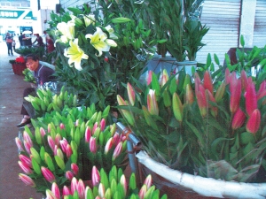 9日上午,記者來到斗南花卉市場百合交易區,只見10多個攤位上擺滿了不同品種的百合花束,但客人寥寥無幾。一位女攤主談起近期的行情,不停地搖頭說:“這久天氣熱,百合花的上市量增加了,但市場交易量上不去,花多了自然就降價了。”
