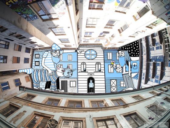 法國藝術家thomas lamadieu拍攝了一組將拆遷建筑的仰視圖,他以全景拍攝的方式將天空與建筑組合在同一張圖片里面,然后在圖片中建筑的四角圍合的天空背景上,進行繪畫創作。藝術家畫以豐富的想象力為藍天背景添加上各種古怪的場景和人物。thomas lamadieu會根據建筑圍合的天空的形狀構思繪畫作品,一個個神奇的場景為我們展示了藝術家心中的另一個世界。