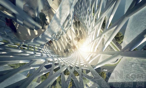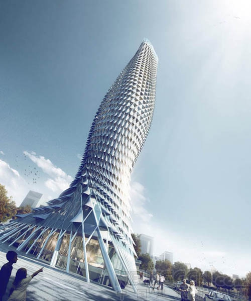 塔身中部膨脹,釋放更多的內部活動空間,塔身整體扭曲,為塔頂獲取最佳的景觀朝向,此方案在景觀塔原型的基礎上,膨脹、扭曲形成一種自然的仿生形態。