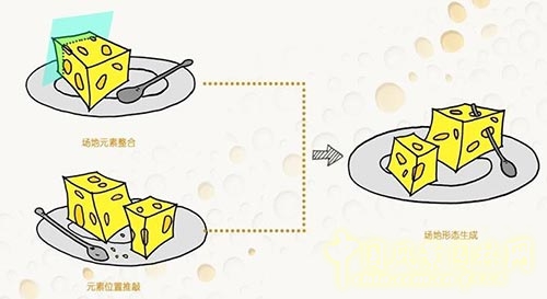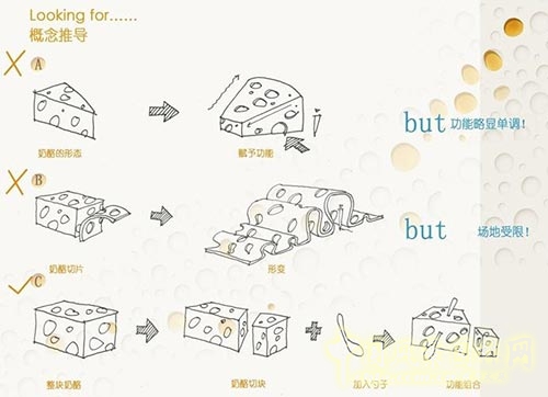 奶酪的形態是設計的靈感,下面是空間結構的演變推倒過程。開始的奶酪造型比較單調,但形變后的場地卻受限,最后我們所確定的設計概念,就是用勺子和奶酪交叉后,進行功能組合,從而形成場地形態。