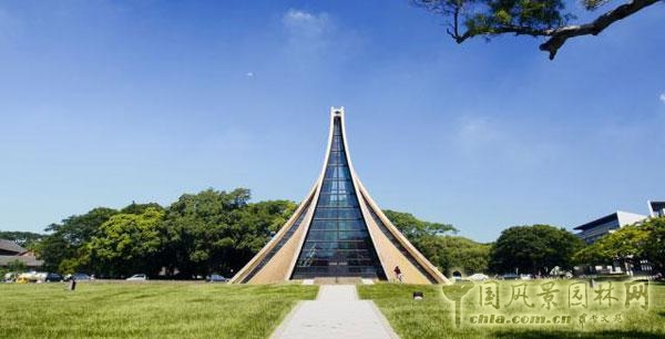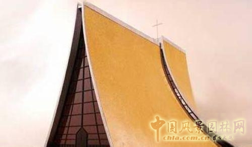 教堂外觀由四片面組合,于屋脊分開,構(gòu)成一線形天窗,四片曲面之屋基與屋脊,兩邊為直線,所形成的曲面,稱為圓錐體雙曲面,使屋檐曲線更具有美感,邊窗溢入的光線給教堂增添了一份神秘感,“一線天”的寓意逐漸體現(xiàn)出來。由于曲面內(nèi)部應(yīng)力沿曲度方向進行,使內(nèi)部無彎折力產(chǎn)生,曲面厚度遂可減少,內(nèi)部增加交叉的補助小梁,用以承受復雜的結(jié)構(gòu)力量。