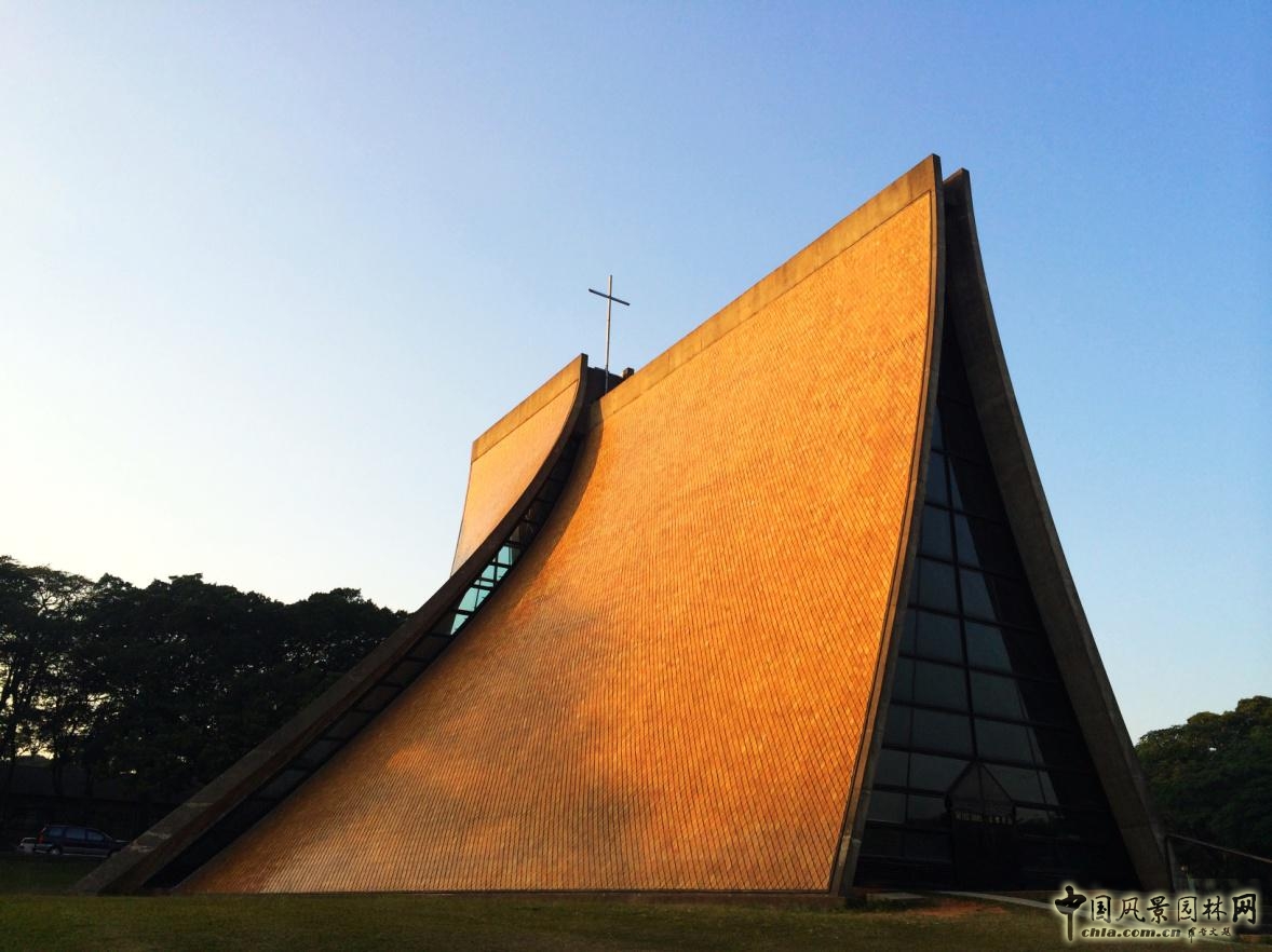 教堂結構材料最初擬議采用磚砌墻面,后擬改為木造,最后才決定采用具可塑性的鋼筋混凝土。在教堂屋面外部用瓷磚瓦,采用黃色富有我國宗教建筑性質,菱形瓦和月部交叉的格子梁,構成形狀呼應的視覺美。瓦分為兩種,每隔一層瓦上有凸出的釘頭,借此釘頭形成的線條,來增強雙曲面的曲度。