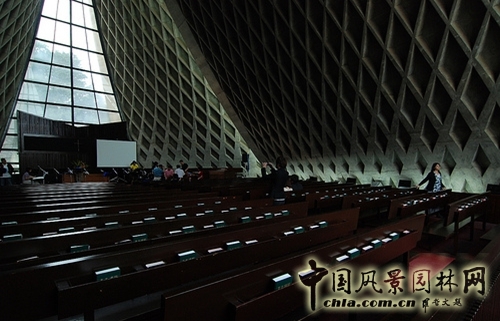 進入教堂后,視野自然沿屋面曲線上升至屋脊天窗,延伸于天空;天界之感召,空靈之境界,油然而生。教堂室內裝飾簡單樸素,室內面的清水水泥,忠實顯露,肋骨型之交叉梁,表明結構內部的應力方向。室內樓板及座席,皆用木制,增加堂內溫暖氣氛,與屋面清水水泥形成鮮明對比。