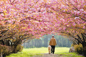 秦嶺腳下一苗圃內,老人、羊與櫻花構成了一幅美麗的圖畫