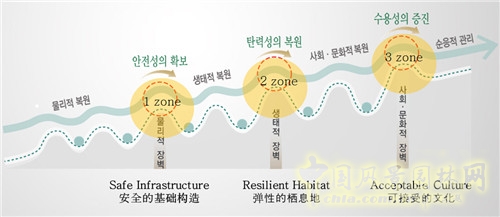 如演示圖所示,首先我們需要保證安全的基礎構造,在此基礎上便可以促進環境以及生態的恢復,在下一個層次中,外來物種將融入進來,使物種更加豐富。這是一個能讓一些新的東西流入到被毀的地域的“圓”。