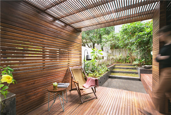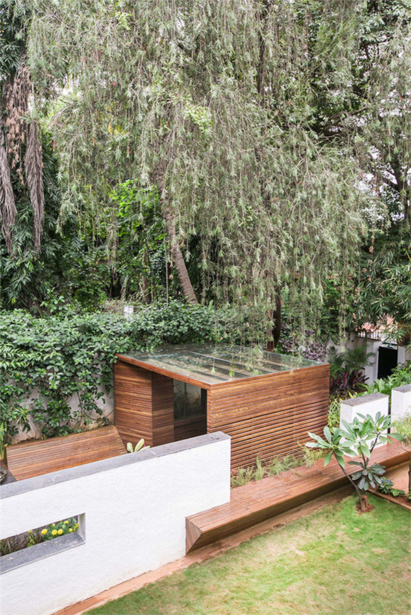 建筑結(jié)構(gòu)采用本地回收木材制成的薄木條包蓋,作為兩個對比強烈的場景之間的一個橋門架,一邊是茂密的“野生”花園,另一邊是草坪席坐區(qū)。