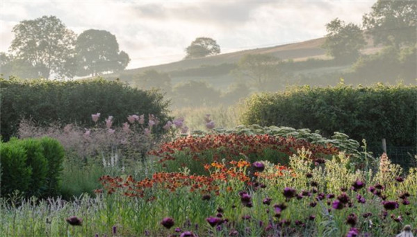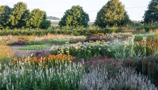 Hauser & Wirth Somerset畫廊把一個18世紀的農舍改建為藝術展覽空間,而 Piet Oudolf為其后的農場設計了園林景觀,花園里種了27000株植物,每平方英尺種幾種植物,種多少數量都經過了Piet Oudolf 的設計。看似隨意的組合,其實都悉數經過其精心的布局,不同的植物以嚴謹的安排湊在一起,反而顯得松容具有童趣,繽紛色彩與朦朧天色映襯得頗像印象派的油畫。