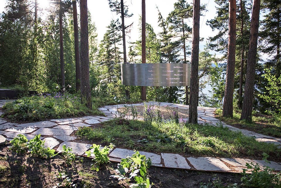 建筑師在幾棵大松樹之間的開放空間里吊起一個大圓環。這里離夏令營近在咫尺,處于地勢較低的地段,面對水面。沿途地面上鋪著大石板,可以有效防止雜草生長,降低維護費用。設計師在紀念點附近精心布置了植物,吸引了島上眾多生物,包括蝴蝶。